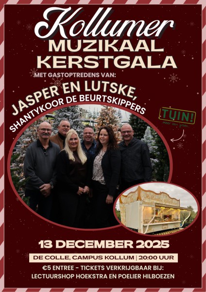 Zaterdag 13 DecemberKOLLUM – Op zaterdag 13 december kom je in Theater de Colle helemaal in de kerstsfeer met het Kollumer Muzikaal Kerstgala. Kom langs en geniet van optredens van Jasper & Lutske en Shantykoor De Beurtschippers.